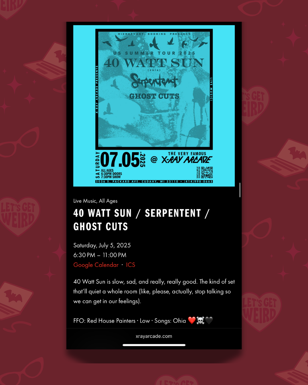 X-Ray Arcade is more than a venue — it’s a DIY hub in Cudahy where punk kids, metalheads, indie diehards, and curious locals all collide. My role has been to capture that chaos and turn it into a consistent, recognizable voice online. From writing irreverent show blurbs and building out social media calendars to designing graphics and managing promo campaigns, I keep X-Ray’s feeds buzzing with the same gritty, playful energy you get when you walk through their doors. The goal is simple: help the right people find the right shows, while keeping the brand as bold and offbeat as the music itself.
